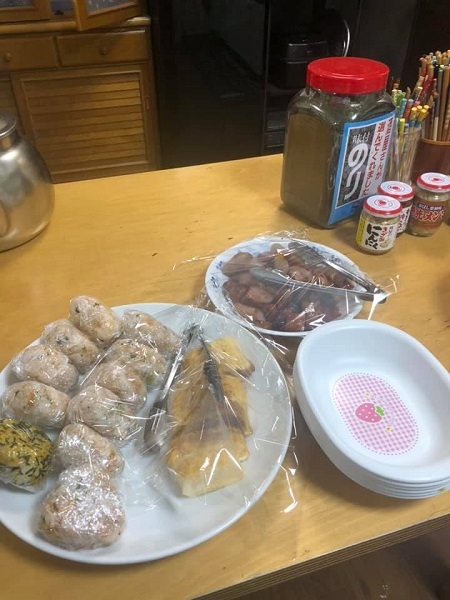おにぎり(しゃけ、のり玉、塩むすび)玉子焼き、ソーセージ、大根のお味噌汁....