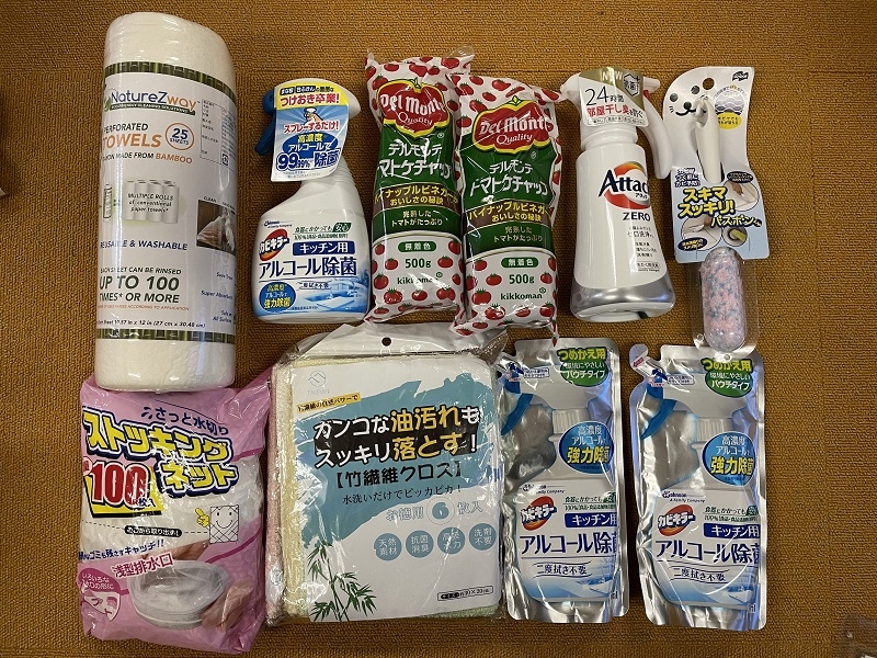 キッチンペーパー、アルコール除菌スプレー、洗剤、竹繊維クロス、ケチャップをいただきました。